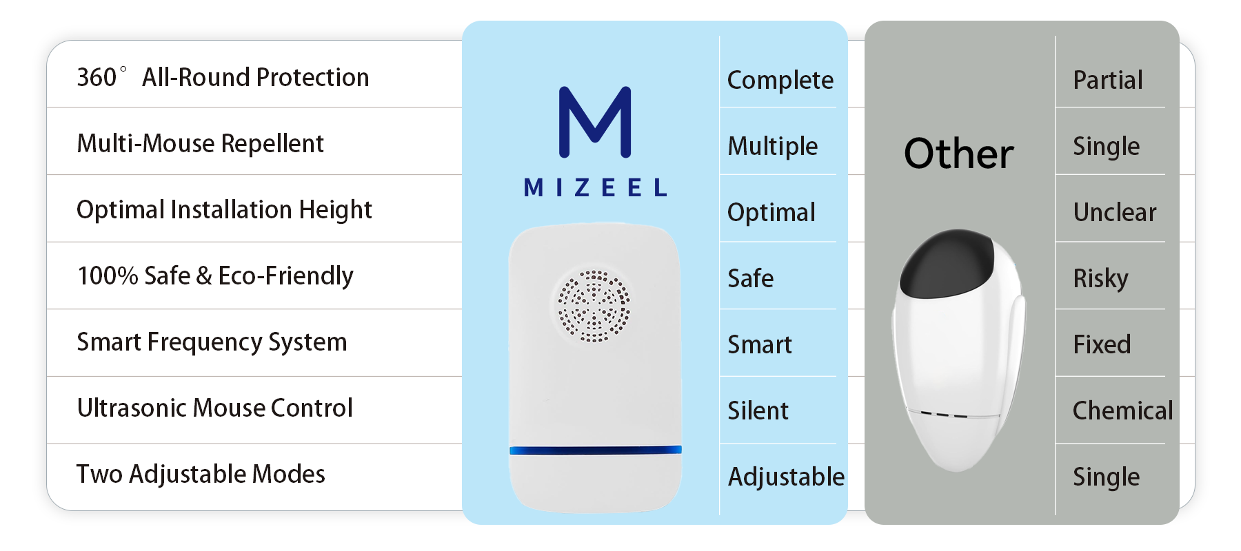 That frustration inspired the creation of Mizeel. The brand is dedicated to developing high-efficiency, silent, and eco-friendly Mouse control solutions with advanced ultrasonic and UV technology and durable design. Its mission is to make Mouse control safer, quieter, and more effective — giving users the confidence and comfort to enjoy Mouse-free spaces, day or night.